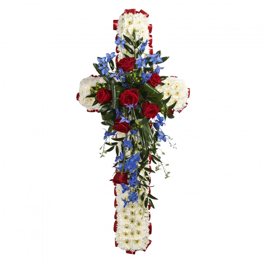 A funeral cross massed in white and edged in ribbon with spray of flowers. Please specify the colour of ribbon and spray flowers that you would like in the instructions box upon ordering. This type of funeral arrangement needs at least 3 working day's notice to deliver. It is not possible to make and deliver an item like this same day. Sizes are 3ft, 4ft or 5ft.