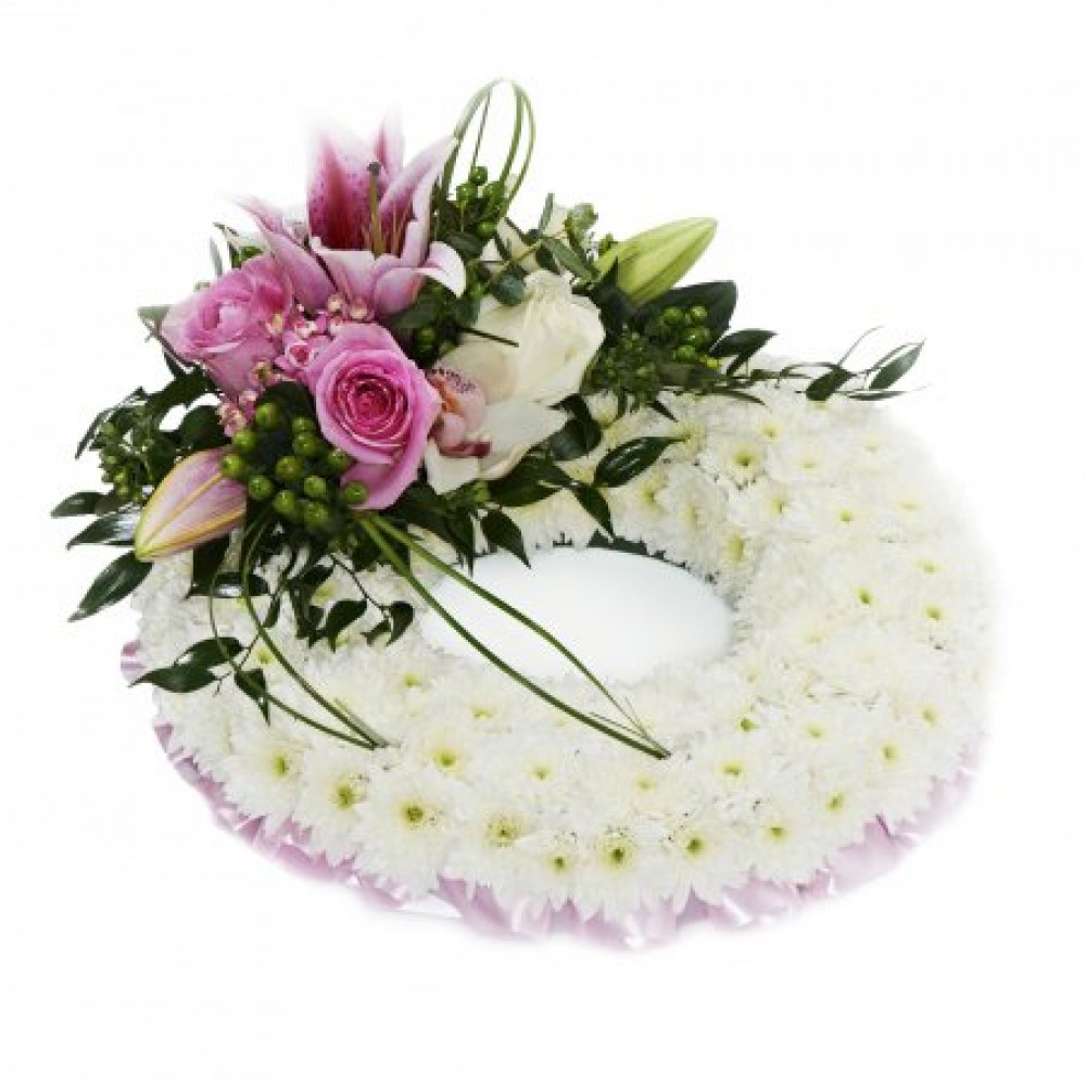 Massed in white with your colour choice of ribbon and mixed flower spray - please specify in instruction box upon ordering.