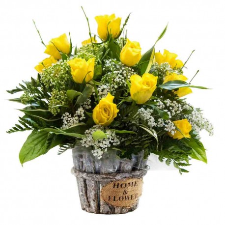 Hand delivered and complete in a pot. Yellow roses and foliage but can be ordered in other colours eg pink or white etc. Please specify in instruction box if a different colour is required and please order in advance to ensure stock. Conatiner may vary.